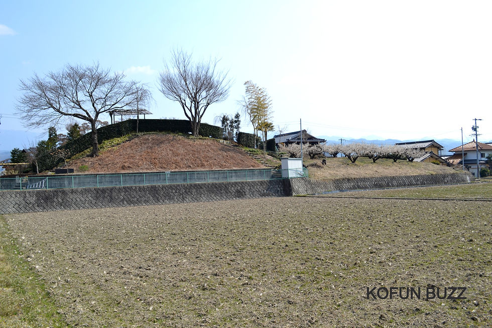 天竜川中流域右岸の河岸段丘上に位置する前方後円墳で、松尾代田の私有地にあります。後円部は展望休憩所になっていて、前方部に梅の木が植えられてます。